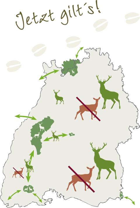 Der bisherige Umgang mit dem Wappentier des Landes Baden-Württemberg ist wildbiologisch falsch und nicht mehr zeitgemäß. Er richtet sich noch immer nach der Rotwildverordnung, die im Jahr 1958 erlassen wurde. Rotwild wird nur in fünf gesetzlich definierten Gebieten geduldet, die insgesamt lediglich 4% der Landesfläche umfassen. Damit bildet Baden-Württemberg das Schlusslicht aller Bundesländer, in denen Rotwild vorkommt, sogar noch hinter dem Stadtstaat Hamburg!